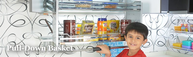 | Pull-down Basket is fitted in the cabinet with magic mechanism, so that it can be very easily pull-down from the cabinet. All the contents along with Basket, without any jerk comes out from cabinet and hangs below the cabinet, which is at very accessible height for the little ones in your family.